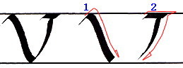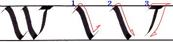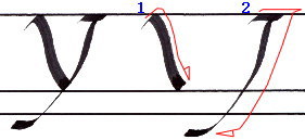 書き順1 ”V”の書き順1と同じですが、終点でしっかりと細い線を