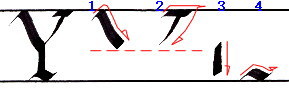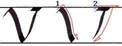 書き順2 ”V”の書き順2と同じ動きでベースラインより下まで降り